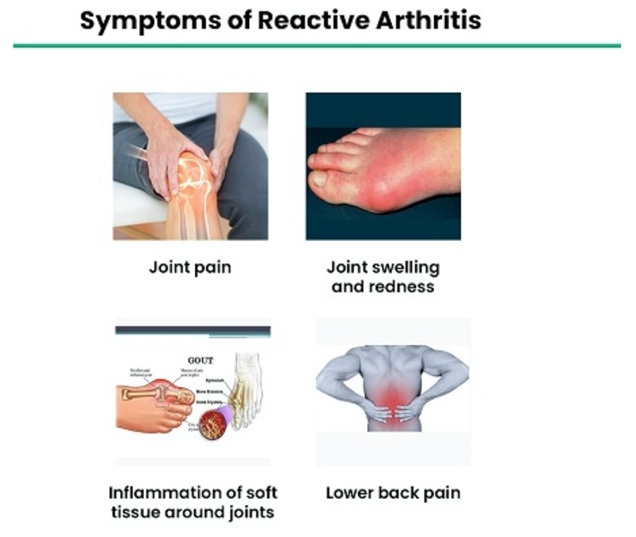 • درد و خشکی (Stiffness). درد مفاصلِ مرتبط با آرتریت واکنشی بیشتر در زانو، مچ پا و پا رخ میدهد. درد ممکن است در پاشنه پا، کمر یا باسن نیز رخ دهد.